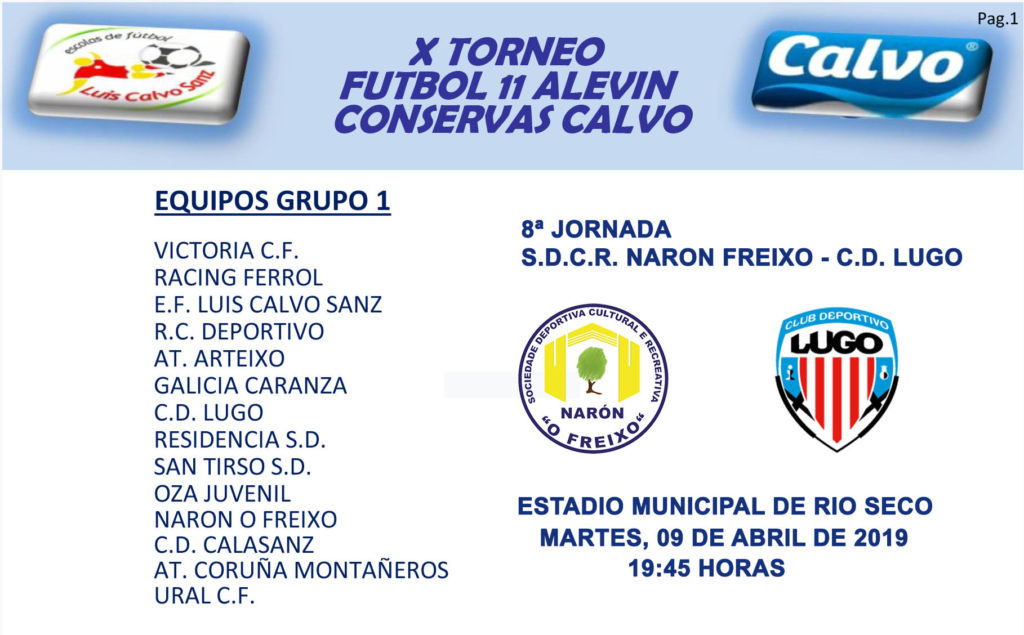 8ª XORNADA LIGA LUIS CALVO 2018-2019 Noticias del club Portada Hoxe, no Estadio Municipal de Río Seco, a S.D.C.R. NARÓN O FREIXO recibe o C.D. LUGO na oitava xornada da Liga Luis Calvo. Os esperamos para animar os alevíns no partido de hoxe. Vamos FREIXO!!!!!
