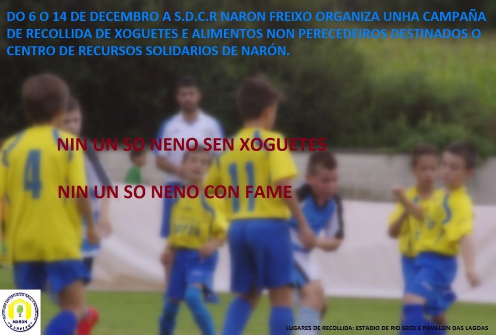 Do 6 ó 14 de decembro a SDCR Narón Freixo e o Club Atletismo Narón desenvolverán unha campaña de recollida de alimentos non perecedeiros, xoguetes e produtos de hixiene persoal para a súa doazón ó Centro de Recursos Solidarios do Concellode Narón.