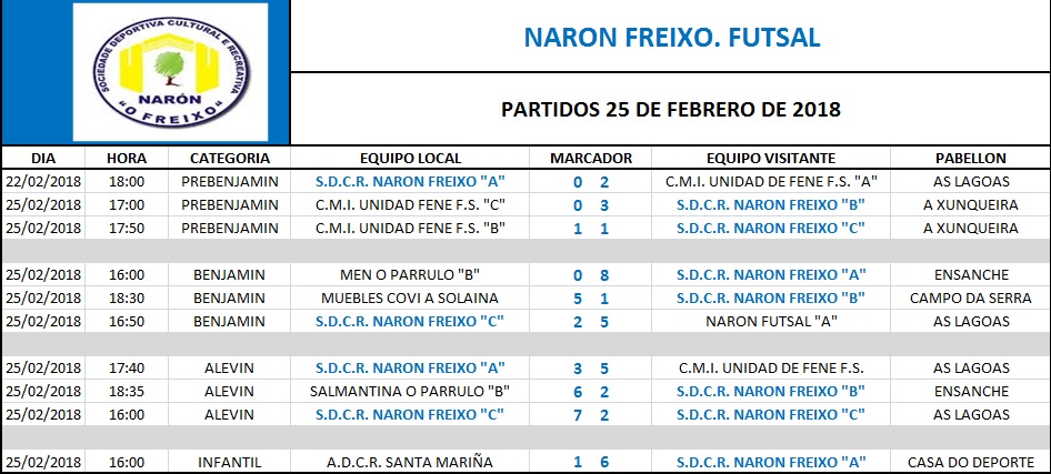 RESULTADOS XORNADA DE LIGA DO 25 DE FEBREIRO. FUTSAL 2017/2018