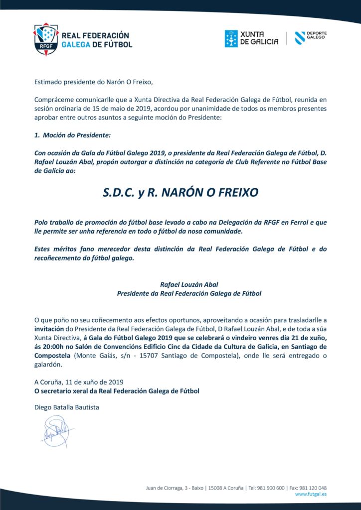 Con ocasión da Gala do Fútbol Galego 2019, o Presidente da FEDERACIÓN GALEGA DE FÚTBOL, D. Rafael Louzán Abal, otorgou a distinción na categoría de CLUB REFERENTE NO FÚTBOL BASE DE GALICIA a S.D.C.R. NARÓN FREIXO.