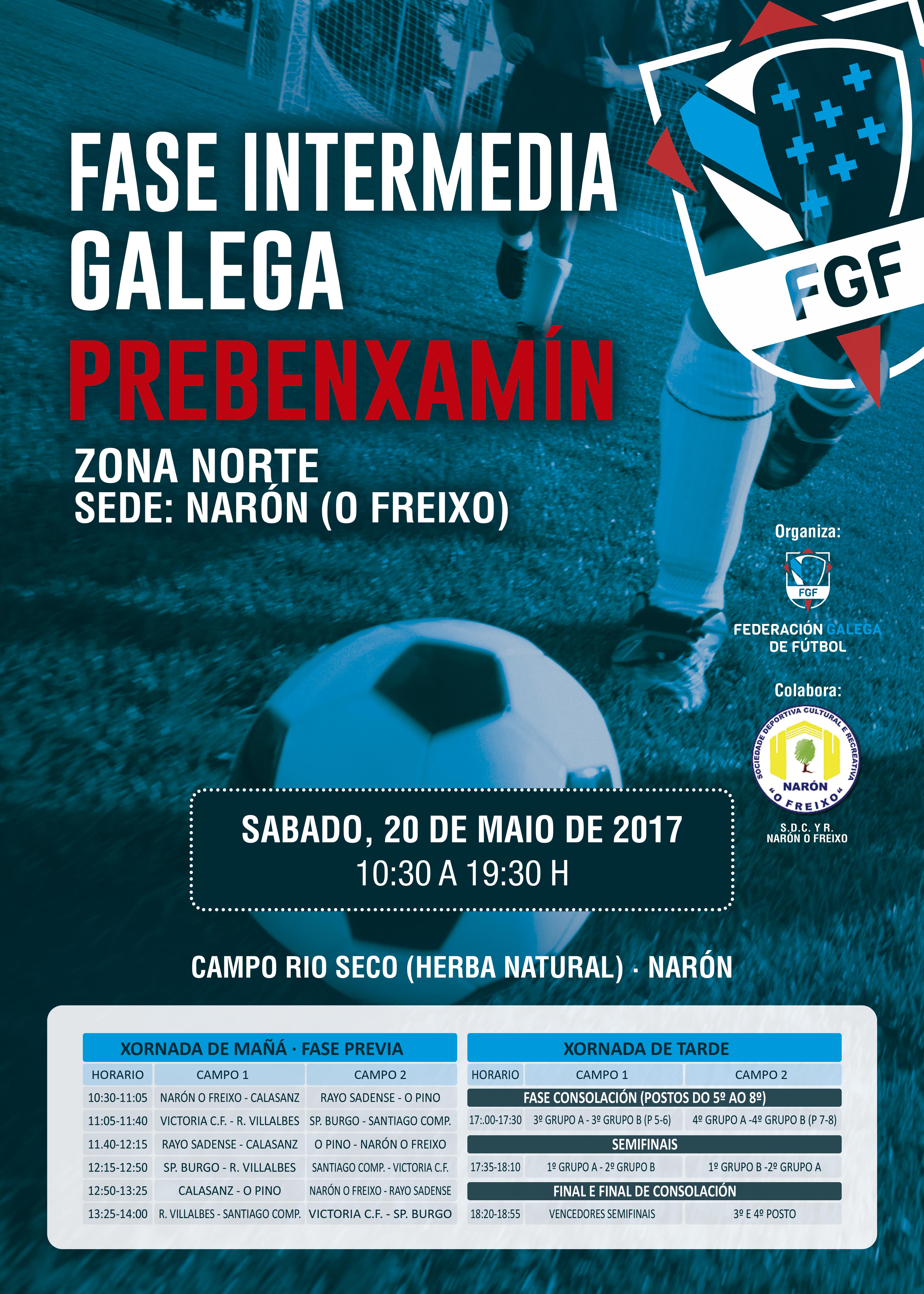 O vindeiro sábado, día 20 de maio, disputarase nas instalacións de Río Seco, o grupo 2 da Fase Final do Campionato Provincial na categoría Pre-benxamin. O Narón Freixo, queda encadrado no grupo A e terá como rivais o C.D. CALASANZ, S.D. O PINO e RAIO SADENSE.