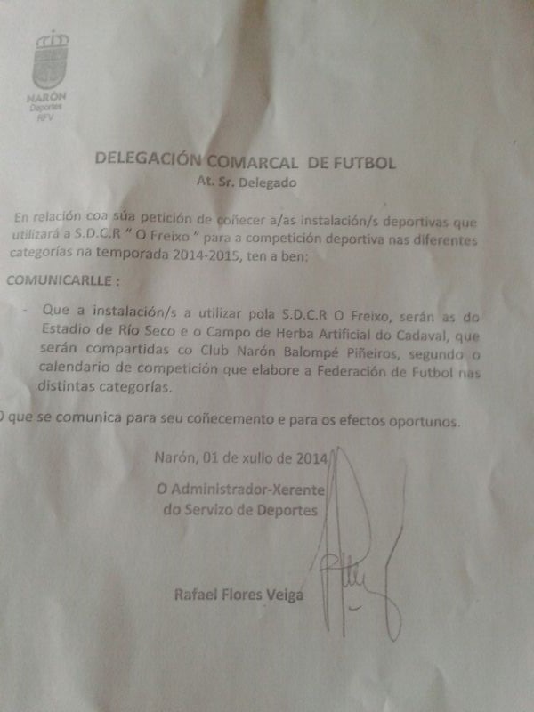 Con fecha 1 de Julio del 2014, mediante escrito ( que adjuntamos en la presente nota informativa) firmado y avalado por el máximo responsable de la gestión del deporte Municipal en Narón, el señor D.Rafael Flores Veiga, Administrador Gerente del Patronato de Deportes del Ayuntamiento de Narón, éste confirmaba al club Narón Freixo, asi como a otras instancias deportivas federativas, que el Narón Freixo utilizará las instalaciones del Cadaval, de manera compartida con el Narón Balompé, en forma y uso todavía por establecer en base a diferentes parámetros, aún no aclarados.