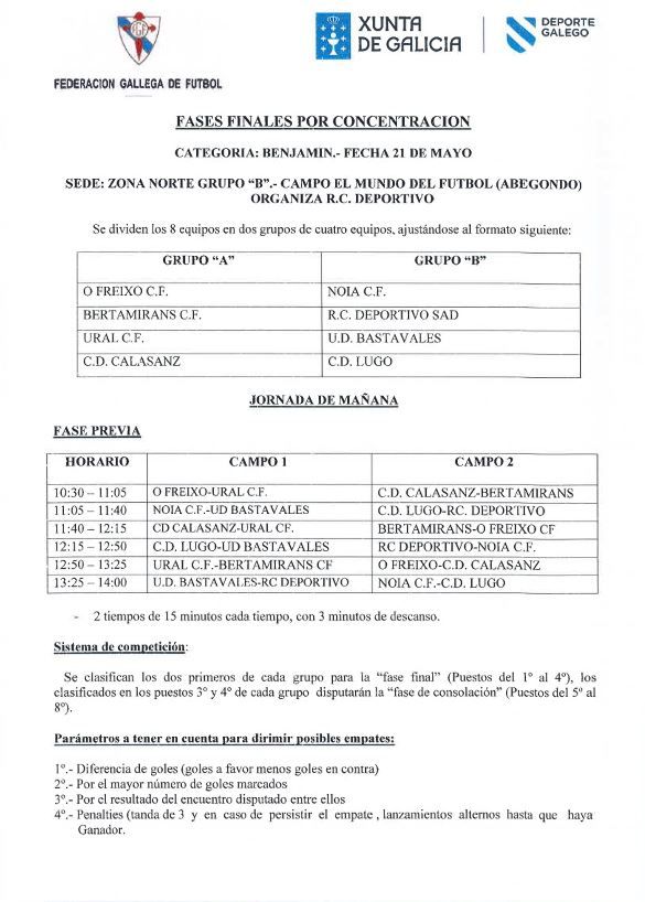 Este sabado dia 21 celebrarase a Fase Final onde o noso Benxamin A como vencedor da Liga da Delegacion de Ferrol, tentara clasificarse para a Final autonomica da Categoria, duros opoñentes os que terá na competicion do sabado, pero sabemos que os nosos nenos darano todo para tentar estar na final. Moita sorte e disfrutade desta fantastica xornada de futbol que vos agarda.