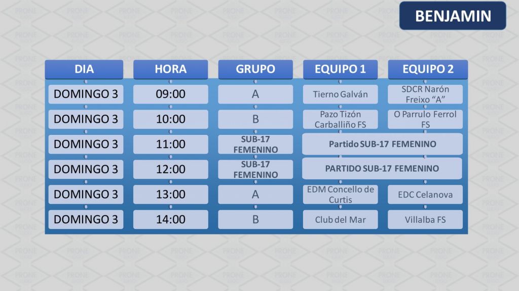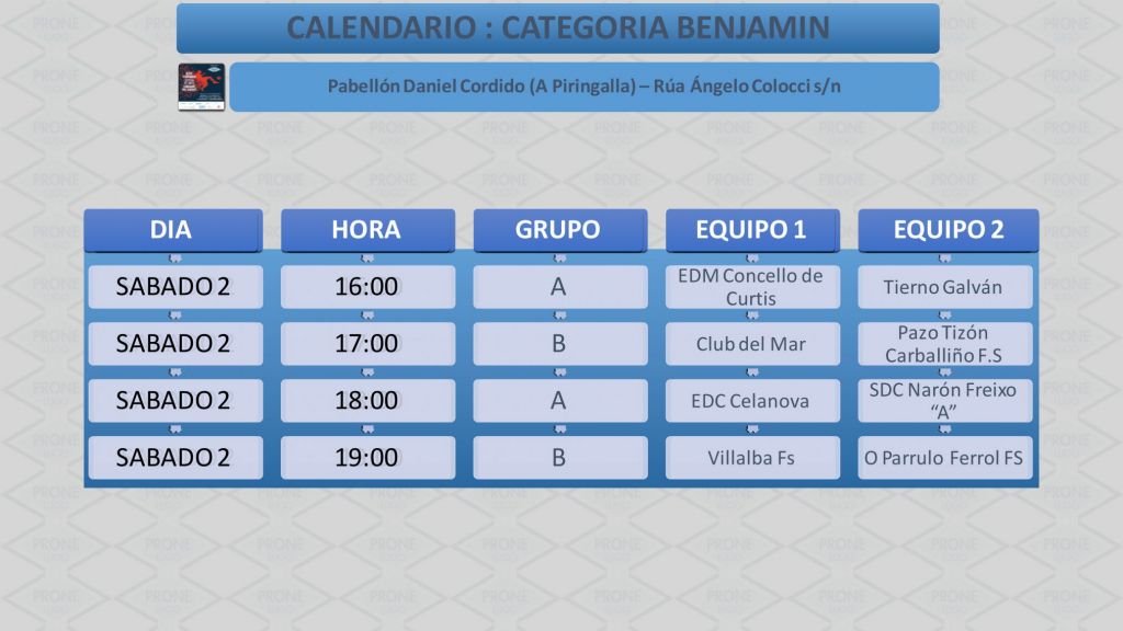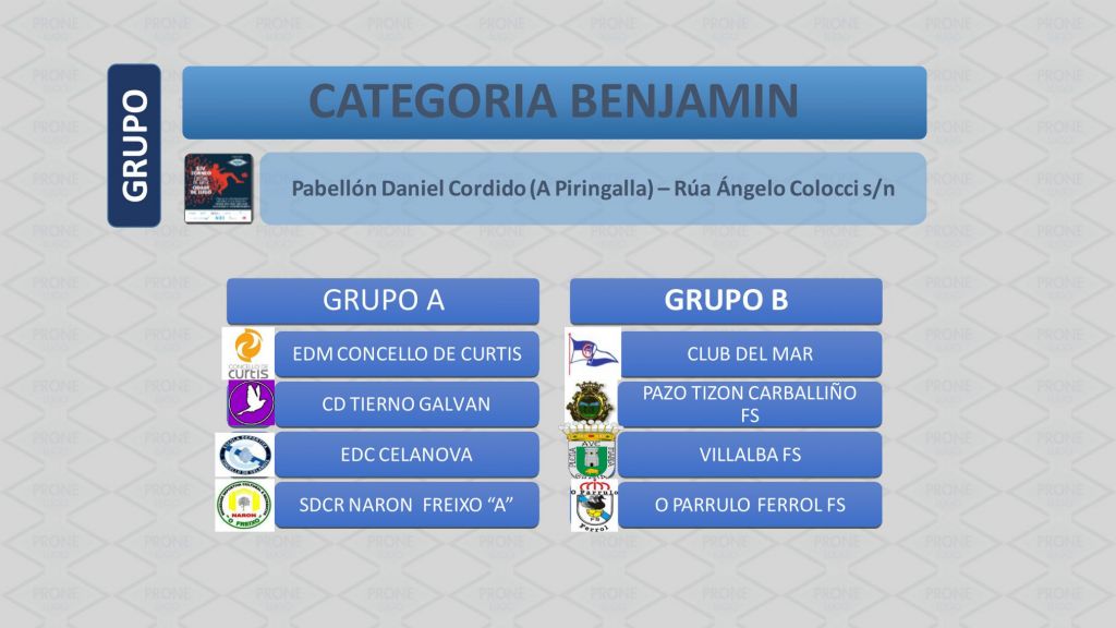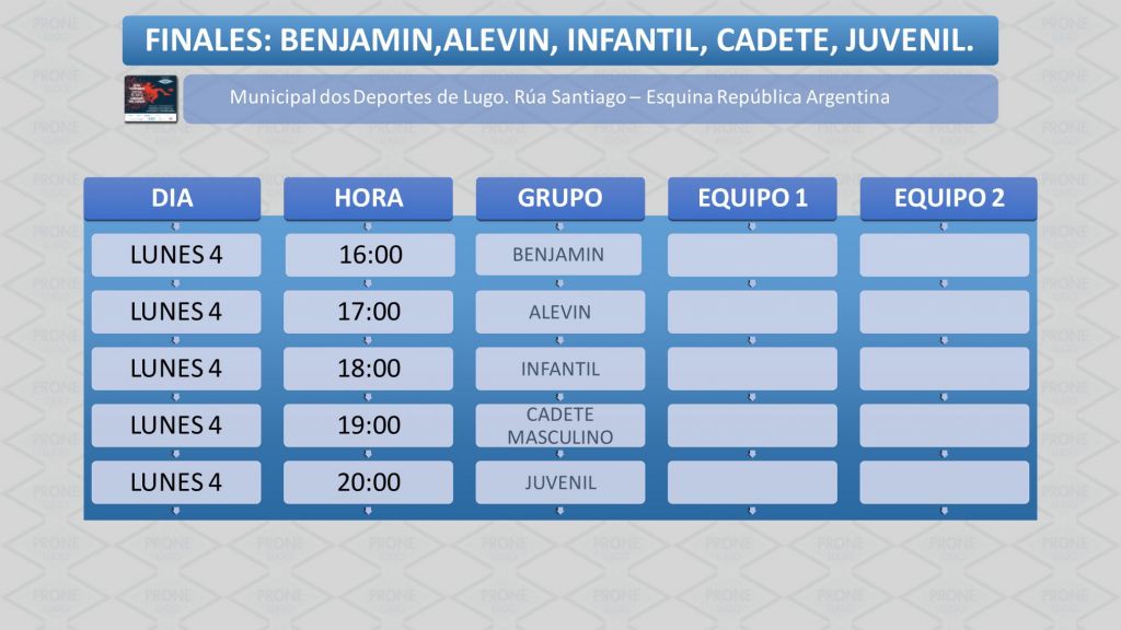 GRUPOS E HORARIOS DA FASE FINAL DE XIV TORNEO DE FUTSAL DE BASE CIDADE DE LUGO TORNEOS FUTSAL Aqui tedes os Grupos e Horarios da Fase final de XIV Torneo de Futsal de Base Cidade de Lugo no que vai a competir o Benxamin «A» do Naron O Freixo.