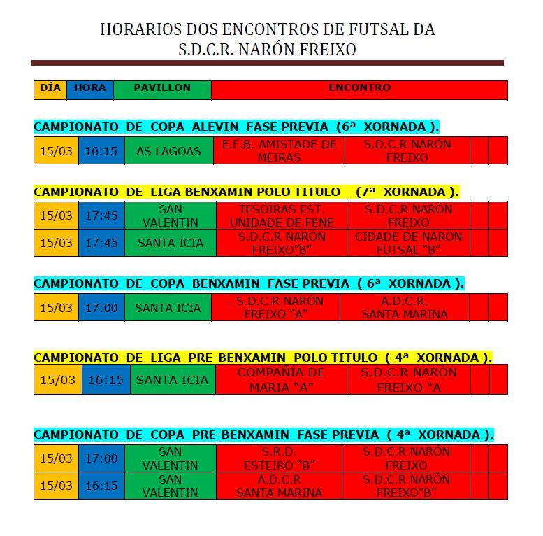 Horarios de todos os equipos da SDCR Narón Freixo do 13 o 15 de MARZO Noticias Fútbol 8 Esta semana volvemos a poñer xuntos os horarios de futbol sala e futbol campo,