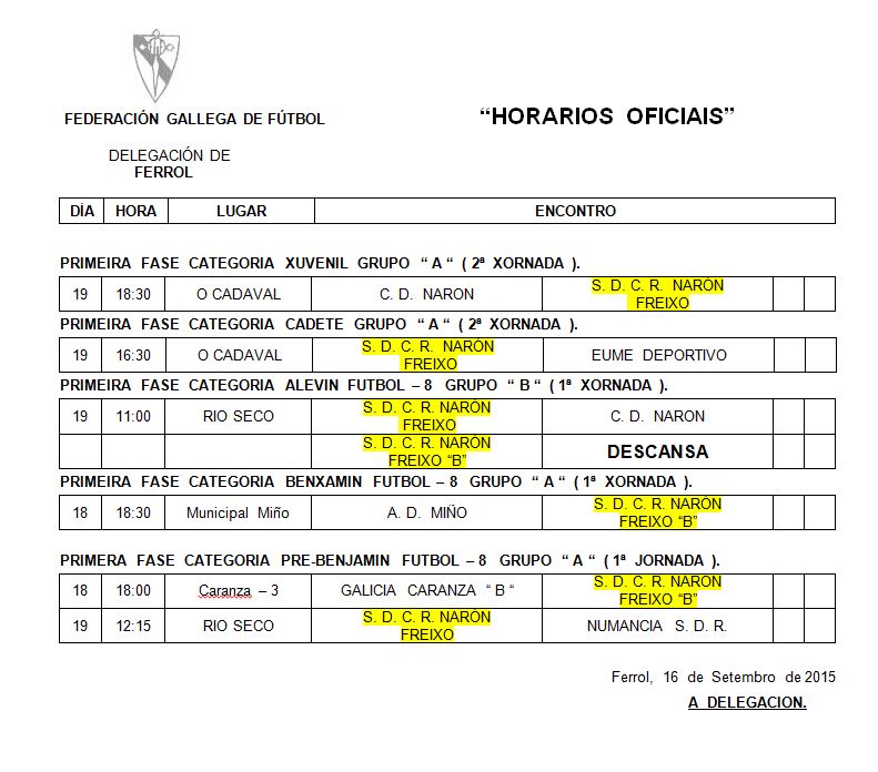Aquí están os horarios de Futbol Campo desta fin de semana, agora con duas sedes O Cadaval para Futbol 11 e Río Seco para Futbol 8, mais equipos, mais futbol e a emocion de sempre co Narón Freixo.