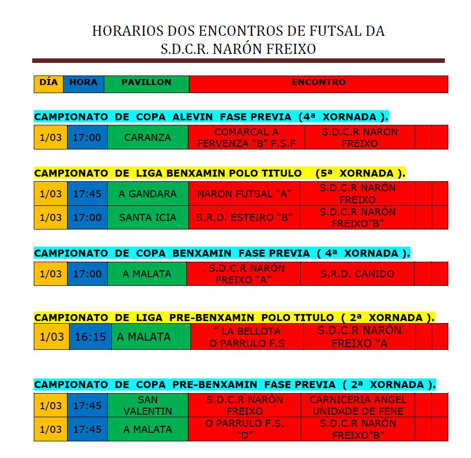 HORARIOS DO 1 DE MARZO DE FUTSAL Fútbol Sala A que non vos imaxinades, como imos comezar o mes de marzo?? Pois claro vendo os emocionantes partidos de FUTSAL do Narón Freixo, que mais se pode pedir.