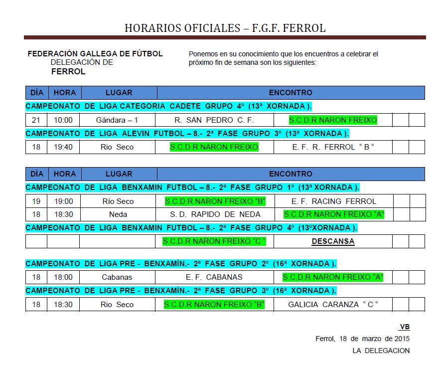 HORARIOS DO 18,19 e 20 DE MARZO DE FUTBOL 8 E FUTBOL 11 Club Xornada rara esta, en que os cadetes xogan na primavera e os demais no inverno. Moita sorte a todos e a disfrutar xogando.