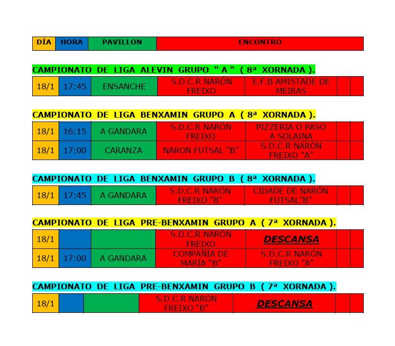 HORARIOS DO 18 DE XANEIRO DE FUTSAL Fútbol Sala Xa tedes aqui os horarios da próxima xornada de Futsal, fixadevos que algúns equipos descansan, asi que poderedes facer outras cousas este domingo , como animar a outros equipos do Narón Freixo.