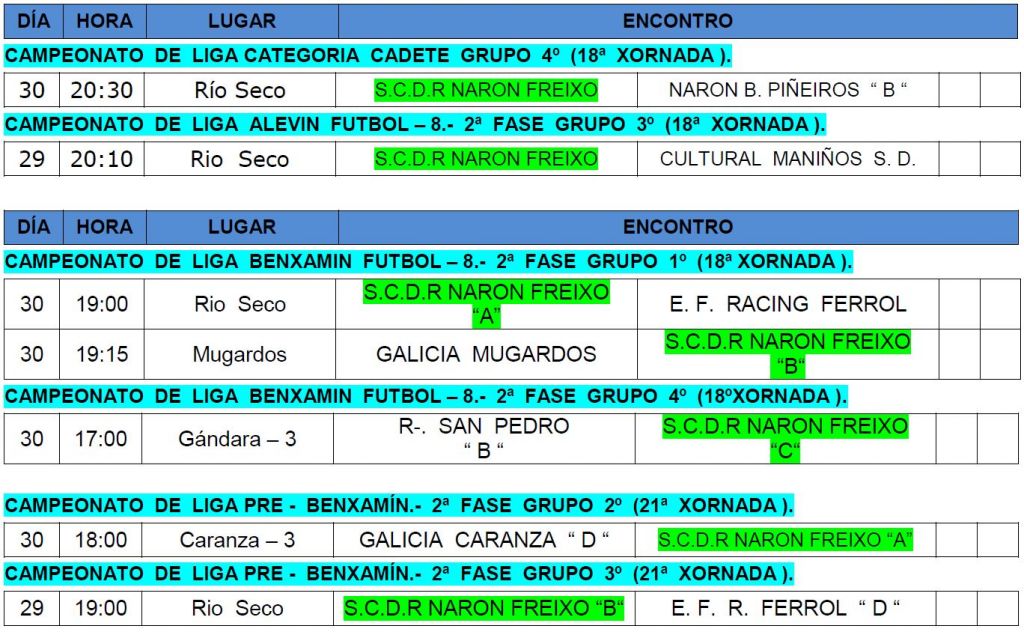 HORARIOS DO 29 e 30 DE ABRIL DE FUTBOL 8 E FUTBOL 11 Noticias Fútbol 8 Aqui estan os horarios de maña e pasado, dos nosos equipos. Moita sorte a todos e a disfrutar porque ista Liga xa esta rematando.