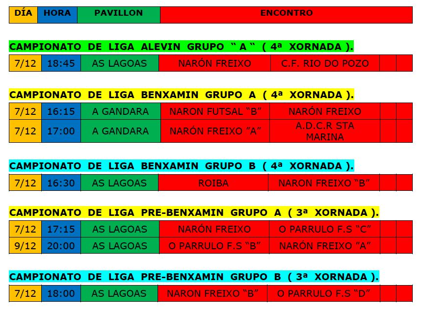 HORARIOS DO 7 DE DECEMBRO DE FUTSAL Fútbol Sala Esta sera a xornada do próximo fin de semana en Futsal, teremos triple enfrontamento en Prebenxamins contra o Parrulo, e outros bos partidos que non poderas perder. Agardamoste