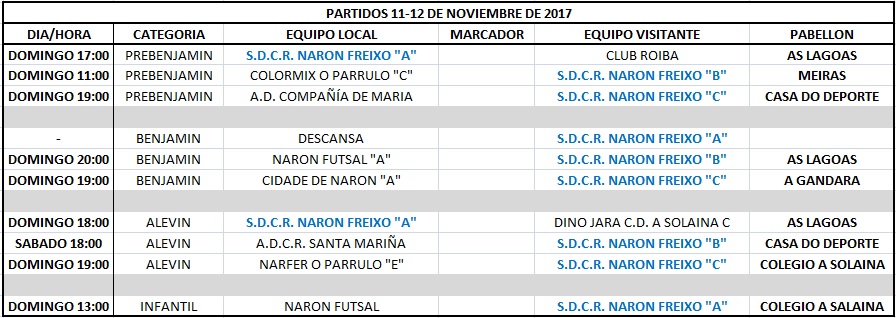 HORARIOS FUTBOL SALA 11 E 12 DE NOVEMBRO HORARIOS E RESULTADOS SEMANAIS Estes son os enfrontamentos dos nosos equipos de fútbol sala nesta fin de semana.