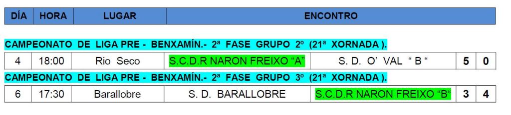 E aqui tedes os resultados desta última xornada de Futbol 8, pleno de victorias para os nosos equipos, e moi especial a do Prebenxamín B que logrou sair dunha preocupante xeira de derrotas.