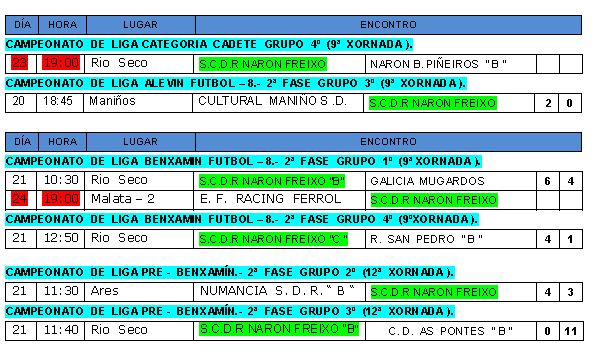Resultados de FUTBOL 8 e 11 do 20 e 21 de febreiro de 2015 Noticias Fútbol 8 As choivas do venres fixeron que se tivesen que adiar os partidos de cadetes e do benxamin A que se disputaran o próximo luns e martes respectivamente, estes foron os resultados dos partidos que si se disputaron.