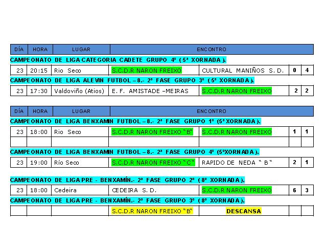 Aqui tedes a tabla cos resultados de todolos nosos equipos de Futbol campo nesta fin de semana