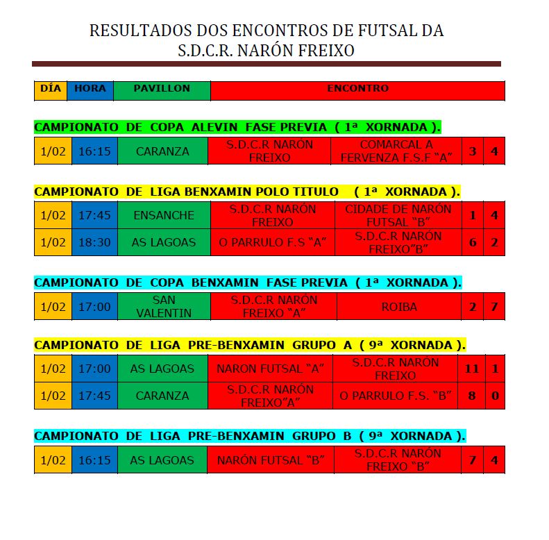Resultados de FUTSAL do 1 de Febreiro Club Vento, frio, saraibas e choiva, moita choiva, pero os nosos nenos de Futsal non teñen problema con isto, xogan o abrigo, e aqui tedes os resultados desta xornada de inverno.