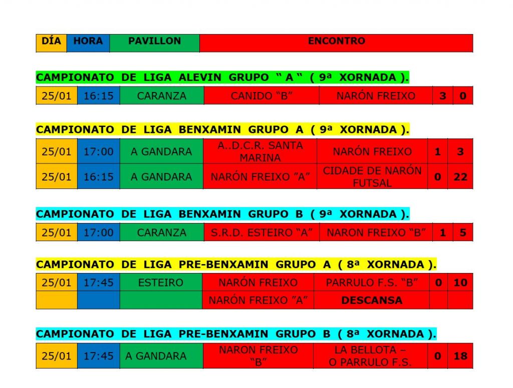 Resultados de FUTSAL do 25 de xaneiro Fútbol Sala Estes foron os resultados de onte dos equipos de Futsal do Narón Freixo.