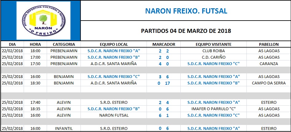 RESULTADOS FUTSAL 04 MARZO 2018 Fútbol Sala HORARIOS E RESULTADOS SEMANAIS RESULTADOS XORNADA DE LIGA DO 04 DE MARZO. FUTSAL 2017/2018