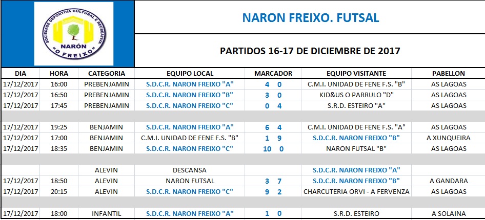 A Liga de futsal despide o ano coa derradeira xornada do 2017. Os equipos da S.D.C.R. NARON FREIXO, deixan as pistas por un descanso ben merecido. Nesta derradeira xornada, todos os nosos equipos que disputaban partido, conseguiron a victoria, para cerrar un gran ano e tomar forzas no Nadal, cargar as pilas e voltar no 2018 os adestramentos ainda con mais gañas.