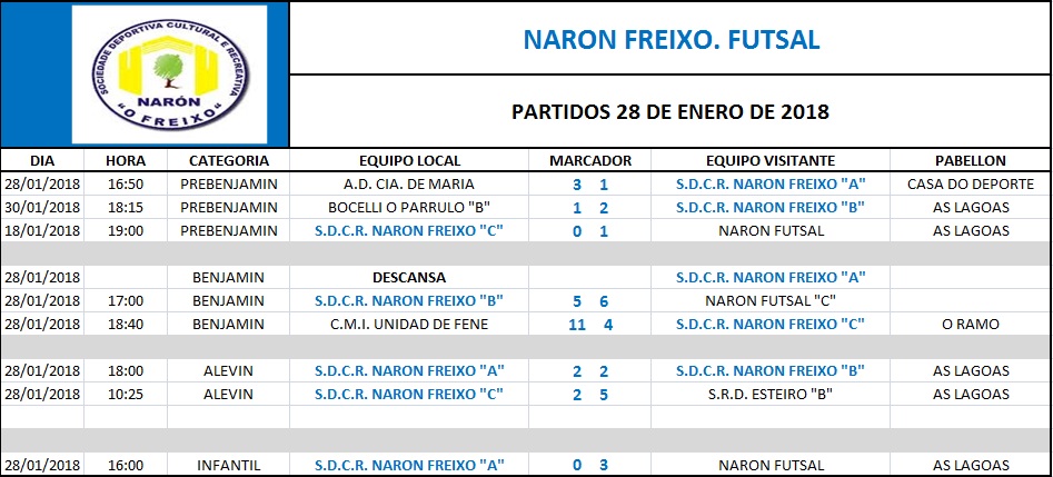 RESULTADOS FUTSAL 28.01.2018 Fútbol Sala HORARIOS E RESULTADOS SEMANAIS RESULTADOS XORNADA DE LIGA DO 28 DE XANEIRO. FUTSAL 2017/2018