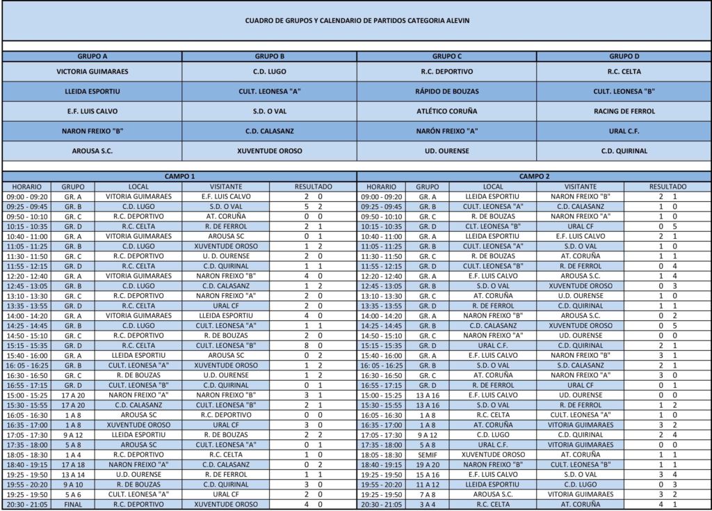 Nesta ocasión, demos un pasito máis e conseguimos a presenza dun equipo como o VITORIA DE GUIMARAES de Portugal, (o cal xa nos comunicou en voz do seu propio Presidente, o agradecemento pola excelente atención prestada á expedición do seu club, resaltando que, sen ningunha dúbida, o ano que vén repetirán visita), para dar un aire internacional a un cartel, xa de seu, excelente como cada tempada. Coa presenza de R. C. CELTA, R. C. DEPORTIVO, C.D. LUGO e Ou.D. OURENSE, completamos representación das catro provincias galegas. Ademais, O AROUSA, S. C, a S.D. O VAL, o C.D. CALASANZ, a E. F. LUÍS CALVO, o XUVENTUDE DE OROSO, o RÁPIDO DE BOUZAS, o ATLÉTICO CORUÑA, o URAL, C. F, o RACING DE FERROL e dous equipos da S.D. C. R. NARÓN O FREIXO, completan a representación galega no Torneo. A estes clubs, hai que sumar a CULTURAL LEONESA que acudiu con dous equipos, o C.D. QUIRINAL e o LLEIDA ESPORTIU, completan un cartel de auténtico luxo para un Torneo, na súa quinta edición.
