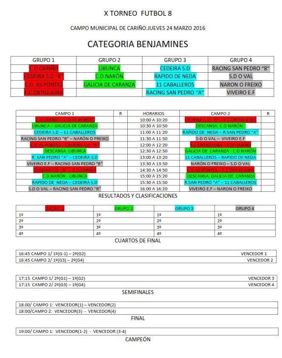 O xoves dia 24 un combinado dos nosos Benxamins B e C, disputaran o torneo de Futbol -8 que organiza o C.D. Cariño e que xa vai pola sua décima edición, o noso combinado tera que enfrontarse na primeira fase da competición a Racing San Pedro, S.D. O Val e a Escola de Futbol de Viveiro, duro grupo, agardamos que sexa cal sexa o resultado final os nosos nenos se divirtan na vila do Ortegal.